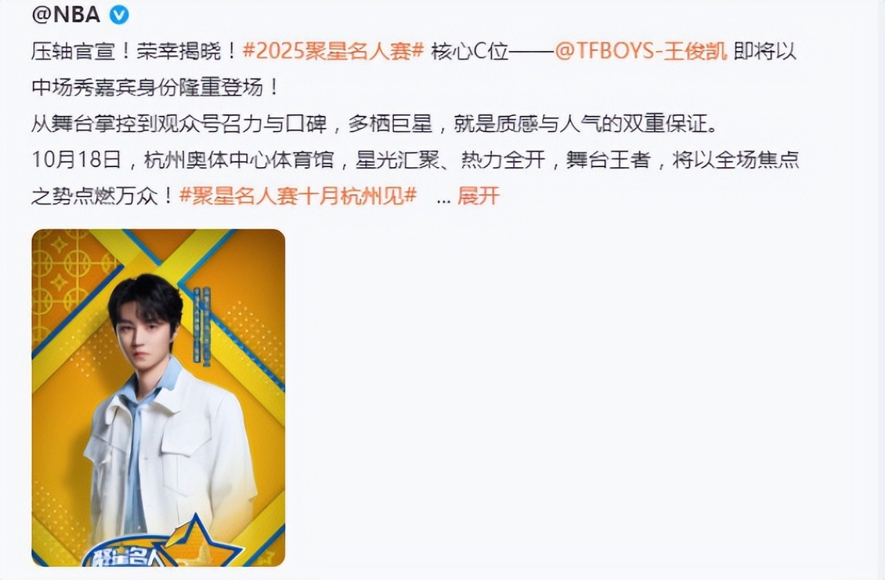 隨著話題討論的熱度和關(guān)注度快速上升,NBA官方發(fā)文進(jìn)行回應(yīng):王俊凱將作為壓軸嘉賓,直接明確王俊凱的“核心C位”,我們都知道,在一張海報中,站在最中心的才是C位,最關(guān)鍵的是,王俊凱被單獨(dú)放大了,C位太明顯了,完全沒有必要爭。
