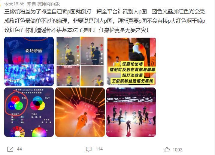 緊接著,任嘉倫粉絲表示:任嘉倫并沒有p圖,藍(lán)色光疊加紅色光會變成玫紅色最簡單不過的道理,而王俊凱的粉絲直接沖了任嘉倫的評論區(qū)。